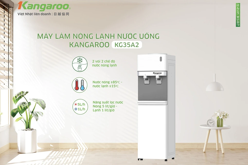 Cây nước nóng lạnh ngày càng được ưa chuộng trong nhiều gia đình, văn phòng… bởi tính tiện ích, tiết kiệm thời gian, công sức cho người dùng. Kangaroo sở hữu công nghệ úp bình có thể lắp đặt được ở nhiều không gian đa dạng. Sản phẩm cho ra 2 nguồn nước nóng – lạnh và ứng dụng công nghệ block siêu bền bỉ, tiết kiệm điện năng.