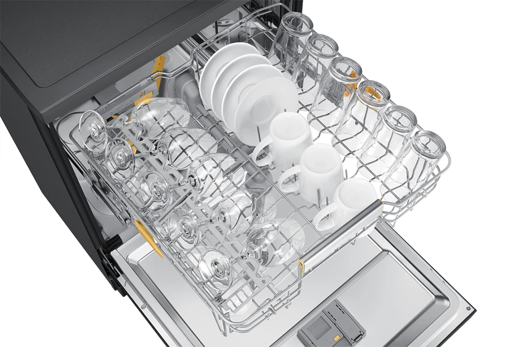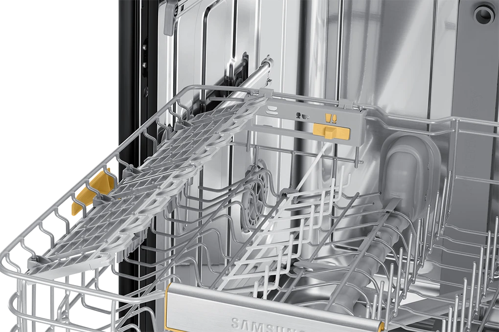 Việc sắp xếp tất cả các loại chén bát khác nhau của bạn có thể là một thách thức. Máy rửa bát Samsung Bespoke DW60CB750FAPSV được trang bị 3 khay rửa gồm: khay dao kéo, khay trên và khay dưới. Phần giá đỡ bên trái của ray số 2 có thể gập linh hoạt, và điều chỉnh theo 3 cài đặt bằng cần gạt phía trong. Nhờ đó, người dùng dễ dàng sắp xếp chén dĩa với hình dạng và kích thước khác nhau thật ngăn nắp.
