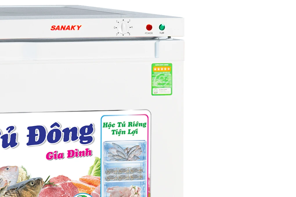 Tủ đông Sanaky có 7 ngăn tủ dạng hộp kín riêng biệt giúp bạn dễ dàng phân chia và sắp xếp các loại thực phẩm để không bị lẫn mùi và vi khuẩn lây lan, đồng thời ngăn khí lạnh không bị thoát ra ngoài quá nhiều khi mở cửa tủ. Đặc biệt hơn, với sản phẩm tủ đông này, các hộc chứa được thiết kế theo dạng ngăn kéo, rất tiện lợi với việc cất giữ thực phẩm.